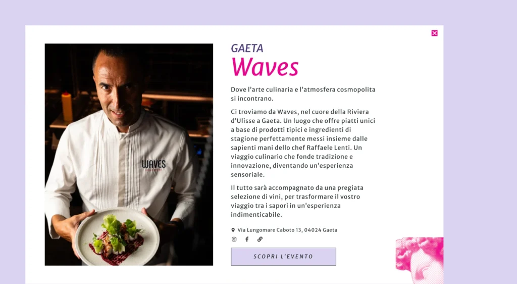 The “Food, Culture, Territory” event is born from the perfect fusion of the best fine wines and the mastery of starred chefs, for a journey through the most authentic and exclusive flavors of Italy. The best restaurants of the Riviera d’Ulisse will welcome you with guided tasting dinners in an intimate atmosphere, to discover expressions and territories, enhanced by contemporary culinary art.